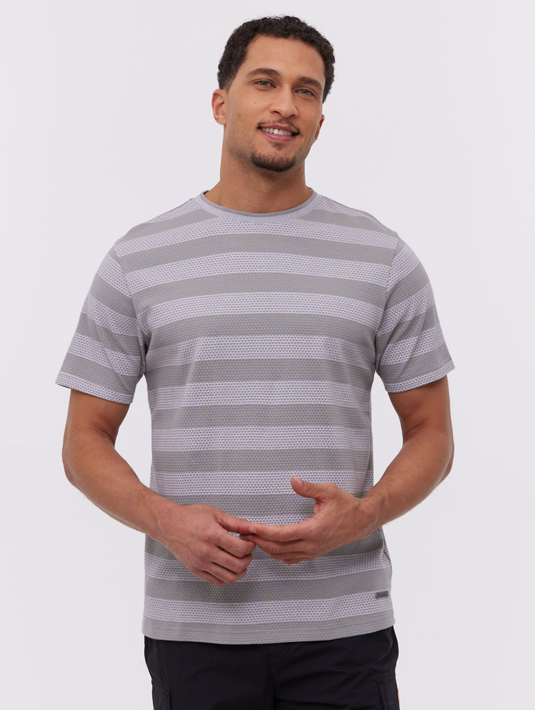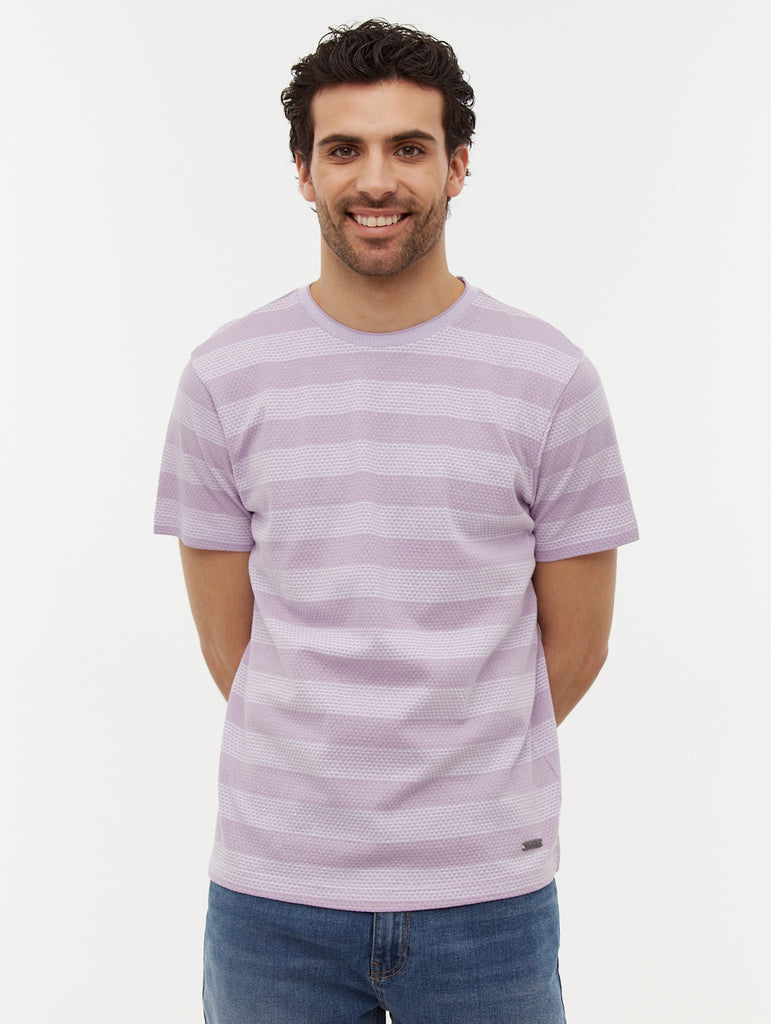 The Pendari Block Stripe T-Shirt by Bench blends classic and modern elements with a textured, honeycomb-like striped material. Made from breathable fabric, it ensures comfort with a ribbed crew neck. A subtle metal logo tag adds refinement, making this tee a versatile staple for effortless everyday wear.