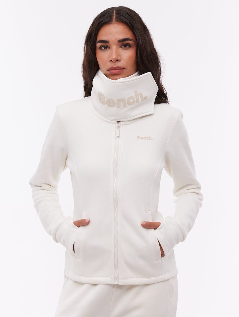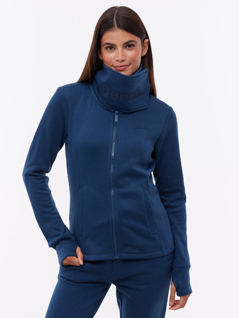 The Annah Wrap-Neck Zip-Up by Bench blends style with comfort, featuring a zipper front and side pockets for essentials. Its standout funnel neck design offers both style and warmth, complemented by a small logo detail. Perfect for transitional weather, it’s a versatile addition for fall and winter wardrobes, offering endless styling possibilities.