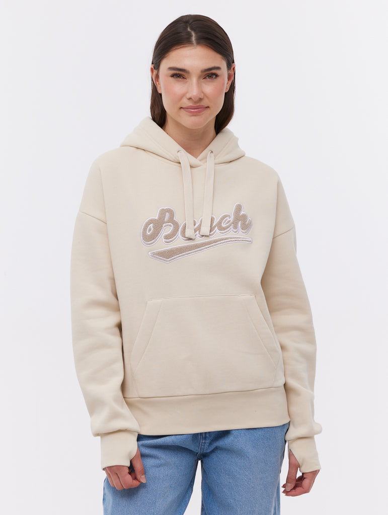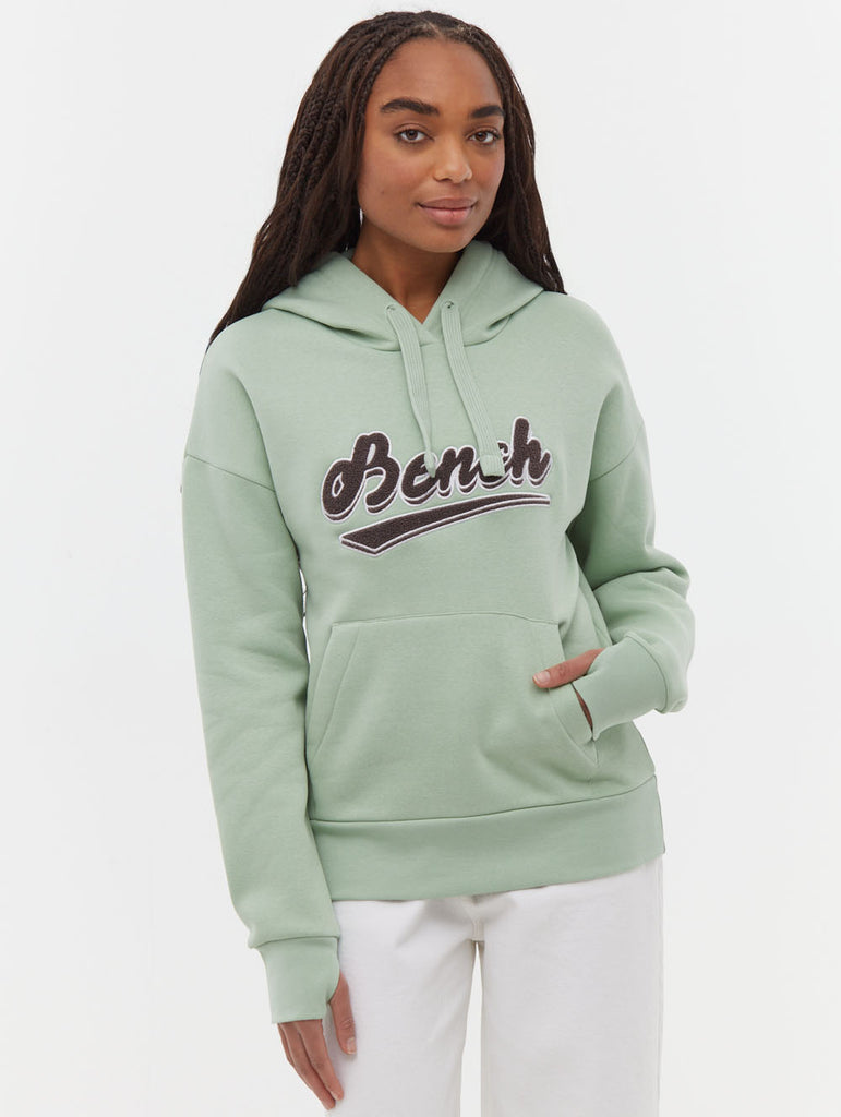 The Karolina Retro Logo Hoodie by Bench combines vintage-inspired style with cozy comfort. Crafted from soft fleece, it features an relaxed fit, a bold varsity-style logo applique, and an adjustable drawstring hood. Ribbed cuffs with thumbholes enhance warmth and functionality, while a kangaroo pocket adds practicality. Perfect for casual, sporty layering.