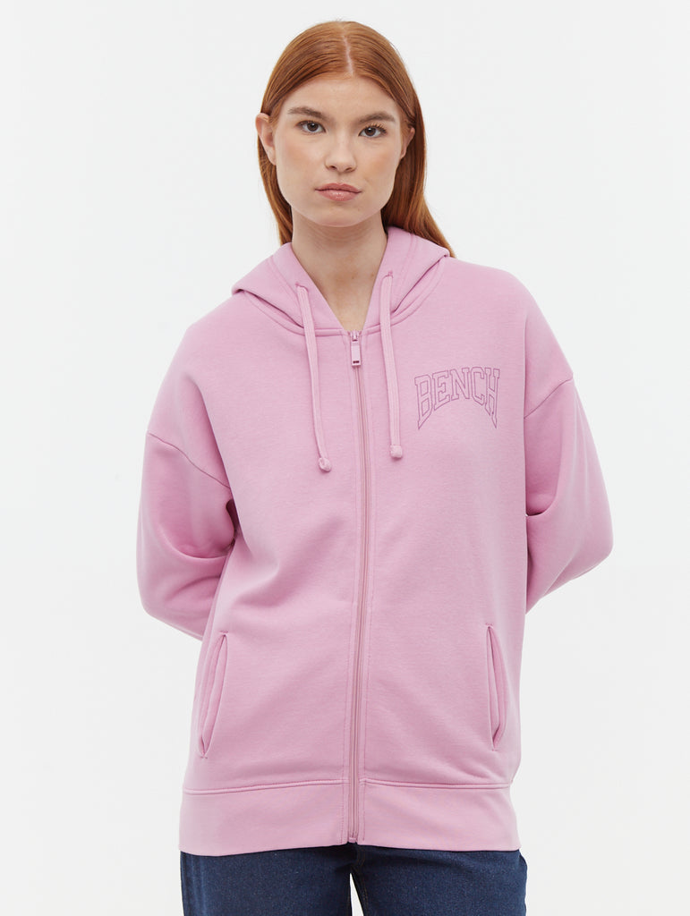 The Zira Athletic Logo Zip-Up Hoodie by Bench blends casual comfort with effortless style. Made from ultra-soft fleece, it features an oversized fit, full-zip front, and adjustable hood. Ribbed cuffs and hem add structure, while a sparkly script back graphic enhances its bold appeal. Ideal for layering with joggers or jeans.